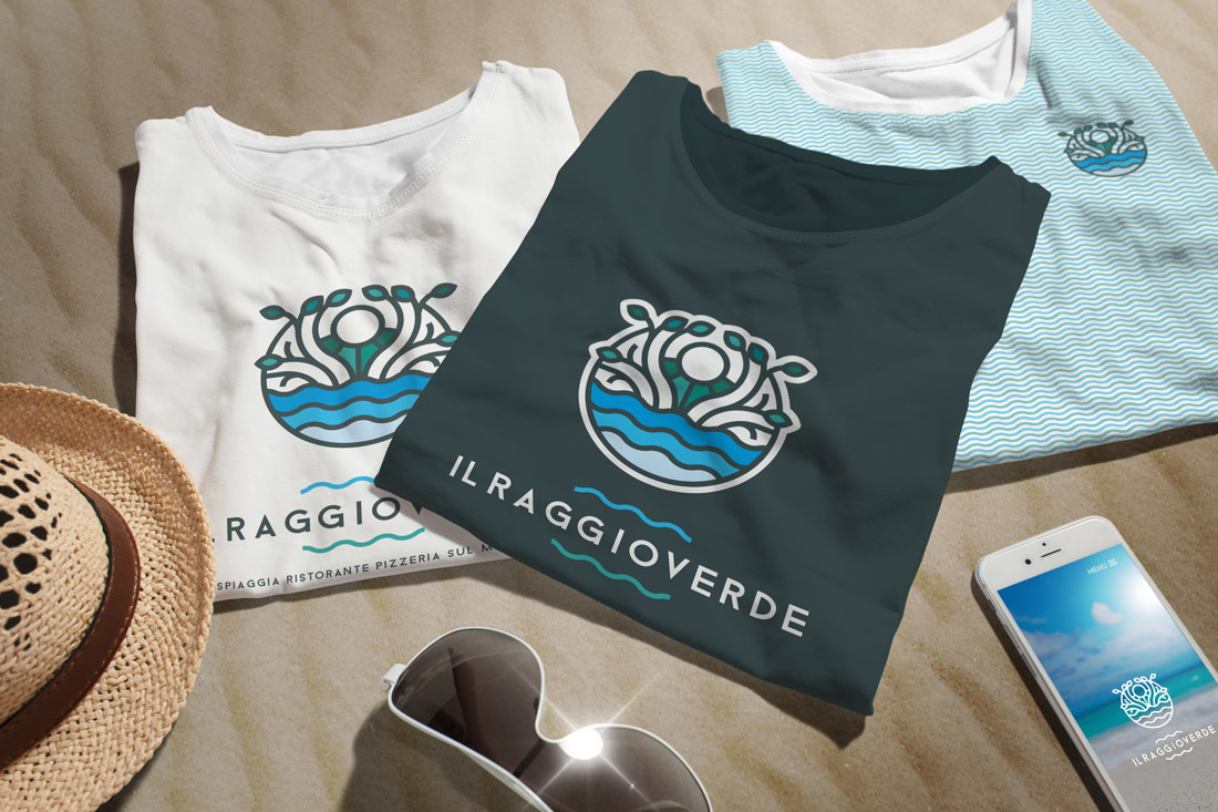 Il logo del Raggio verde ha lo scopo di mostrare a pieno quello che la struttura rappresenta, uno stabilimento balneare, i servizi che offre e ovviamente il sole ed il mare.